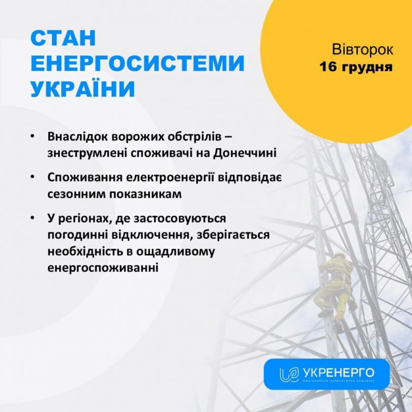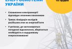 Укренерго: стан енергосистеми України 16 грудня